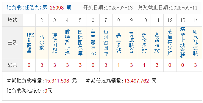 - 足彩25099期开奖结果:一等奖14注 单注奖金49.8万元 (2025/07/14 17:23)