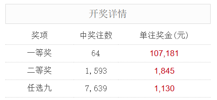 足彩25098期开奖结果:一等奖64注 单注奖金10.7万元