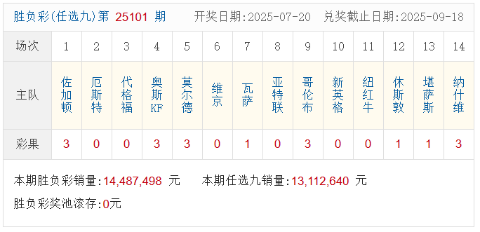 - 足彩25099期开奖结果:一等奖14注 单注奖金49.8万元 (2025/07/14 17:23)