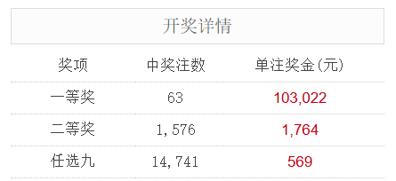 足彩25101期开奖结果:一等奖63注 单注奖金10.3万元