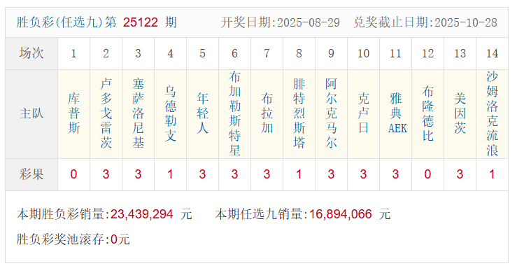 - 足彩25116期开奖结果:一等奖无人中 二等奖22注26.3万 (2025/08/22 15:06)