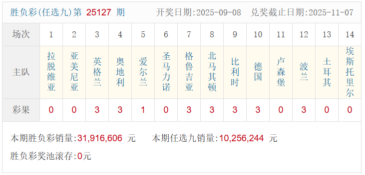 足彩25127期开奖结果:一等奖井喷9.5万注