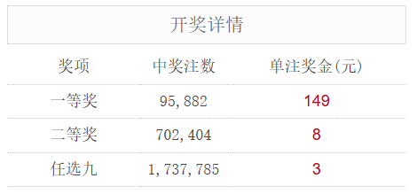 北京时间9月8日,足彩25127期开奖。本期全国中出一等奖95,882注,每注奖金149元,二等奖中出702,404注,每注奖金8元。另外,任选9场中出1,737,785注,每注奖金3元。