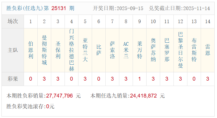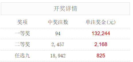 北京时间9月15日,足彩25131期开奖。本期全国中出一等奖94注,每注奖金132,244元,二等奖中出2,457注,每注奖金2,168元。另外,任选9场中出18,942注,每注奖金825元。