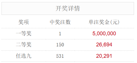 北京时间9月17日,足彩25132期开奖。本期全国中出一等奖1注,每注奖金5,000,000元,二等奖中出150注,每注奖金26,694元。另外,任选9场中出531注,每注奖金20,291元。