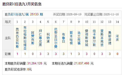 足彩25133期开奖结果:一等奖308注 单注奖金5.96万元