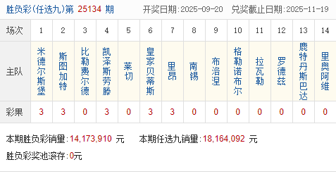 - 足彩25131期开奖结果:一等奖94注 单注奖金13万元 (2025/09/15 21:39)