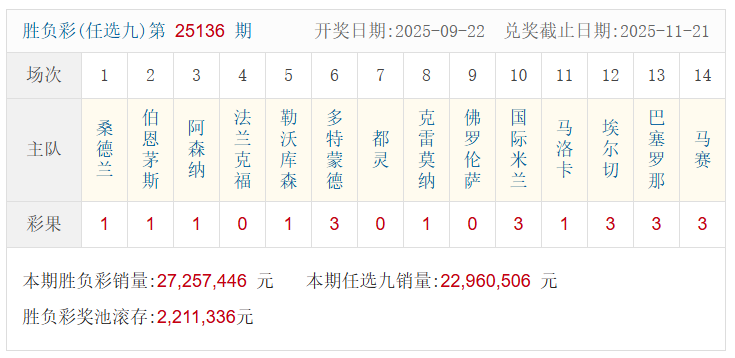 - 足彩25135期开奖结果:一等奖75注 单注奖金13.6万元 (2025/09/21 23:02)