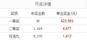 北京时间10月15日,足彩25144期开奖。本期全国中出一等奖35注,每注奖金423,593元,二等奖中出1,419注,每注奖金4,477元。另外,任选9场中出5270注,每注奖金1,412元。