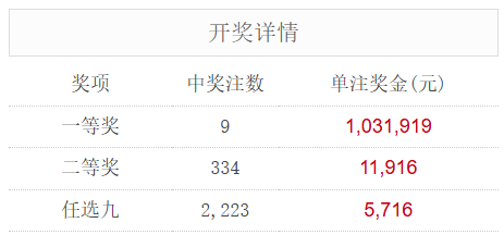 足彩25147期开奖结果:一等奖9注 单注奖金103万多元