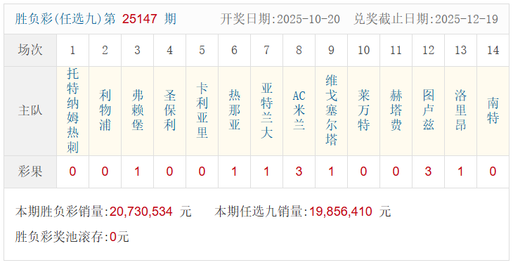 - 足彩25142期开奖结果:一等奖38注 单注奖金28.4万元 (2025/10/12 12:01)