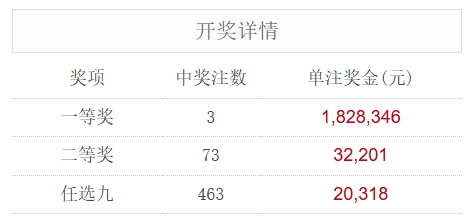 北京时间10月29日,足彩25155期开奖。本期全国中出一等奖3注,每注奖金1,828,346元,二等奖中出73注,每注奖金32,201元。另外,任选9场中出463注,每注奖金20,318元。