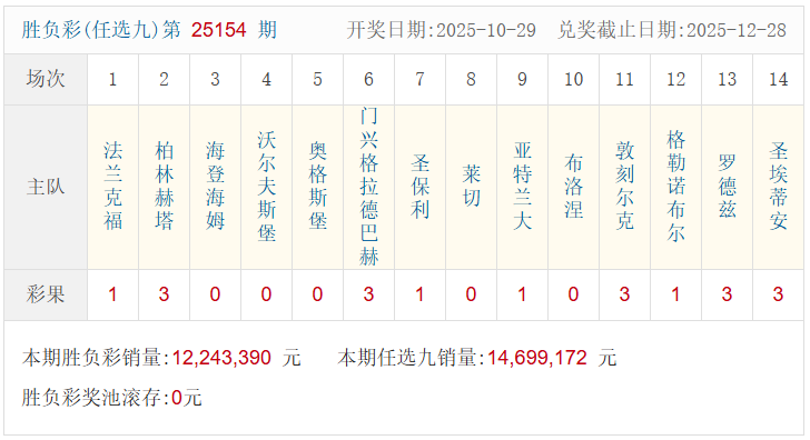 本期足彩销量12,243,390元,本期任选九销量14,699,172元,开奖结束后,足彩奖池滚存0元。