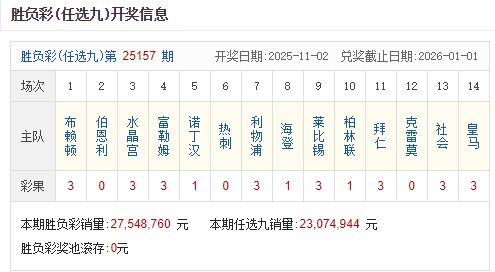 - 足彩25158期开奖结果:一等奖36注 单注奖金33万元 (2025/11/03 18:06)