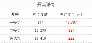 足彩25157期开奖结果:一等奖697注 单注奖金1.77万元