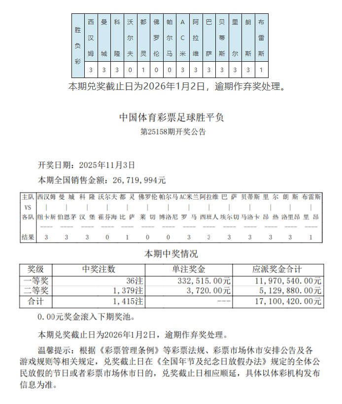 - 足彩25158期开奖结果:一等奖36注 单注奖金33万元 (2025/11/03 18:06)