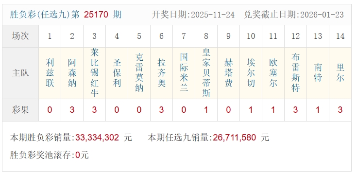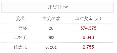 北京时间11月24日,足彩25170期开奖。本期全国中出一等奖26注,每注奖金574,375元,二等奖中出963注,每注奖金6,646元。另外,任选9场中出6,204注,每注奖金2,755元。