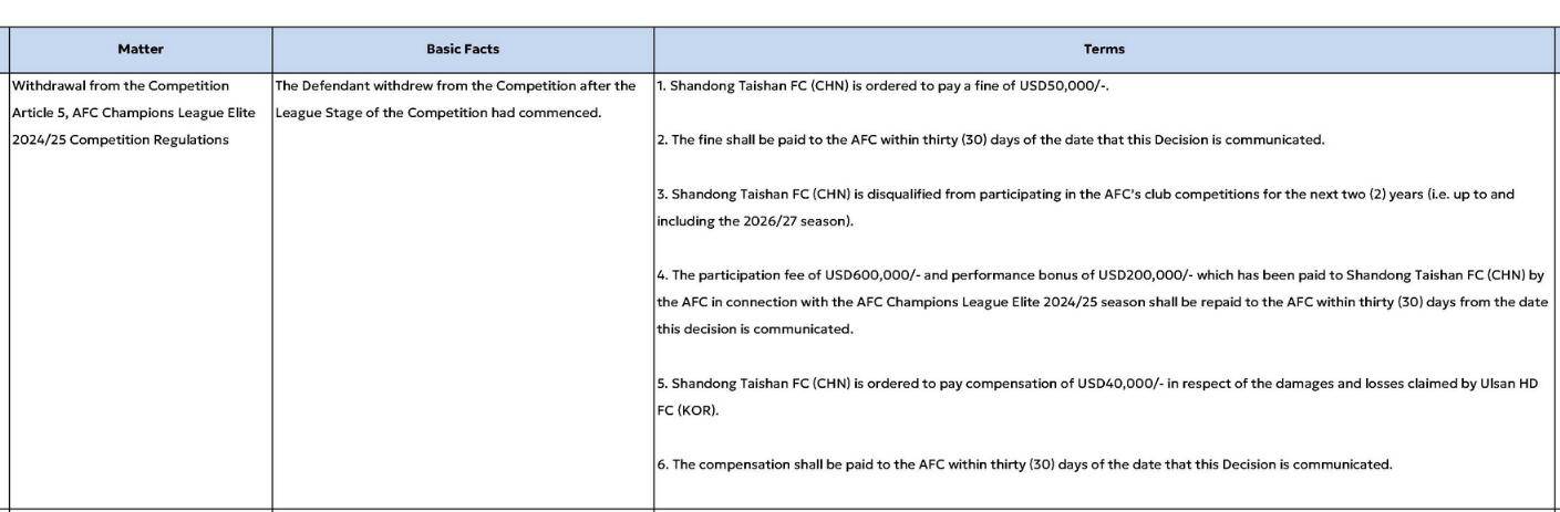 3、亚足联已向山东泰山足球俱乐部(中国)支付的2024/25赛季亚冠精英联赛参赛费600,000美元及绩效奖金200,000美元,须在本决定送达之日起三十(30)日内退还亚足联。