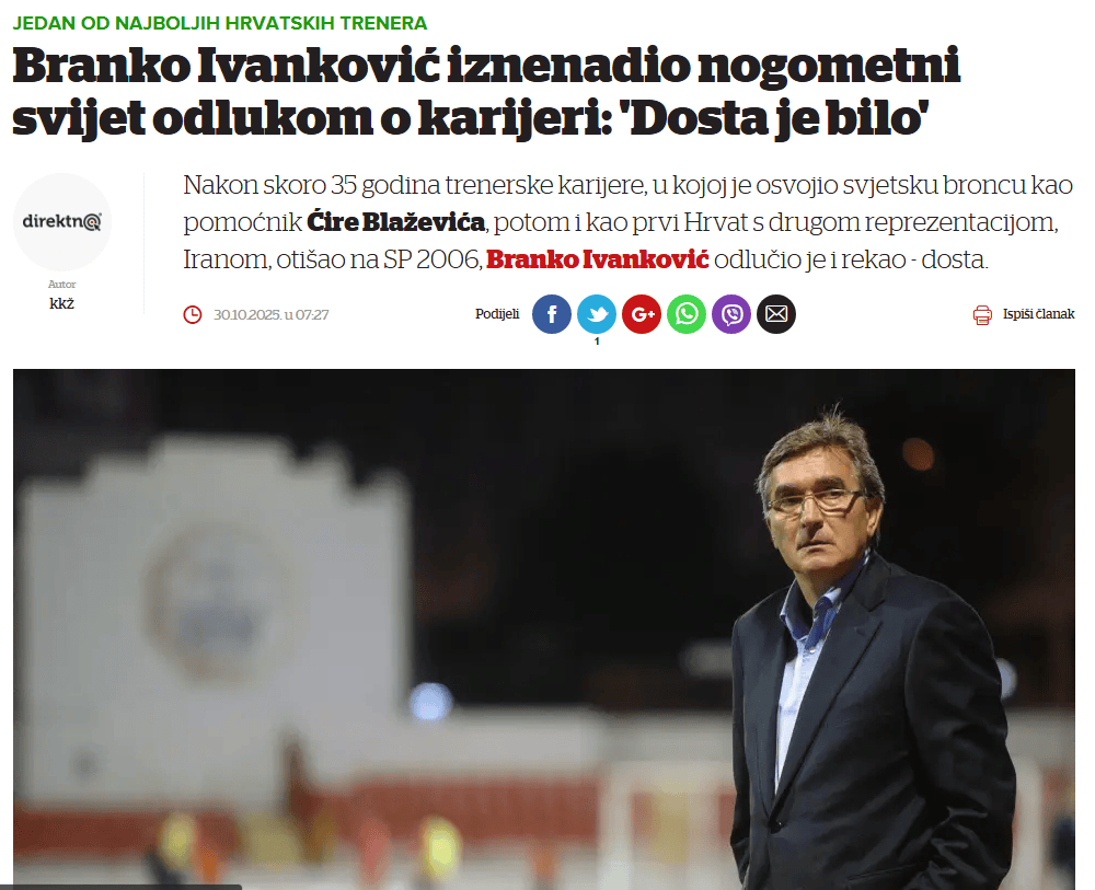 北京时间10月30日消息,据多家克罗地亚媒体证实,在执教近35年后,前国足主帅伊万科维奇决定结束自己的教练生涯。