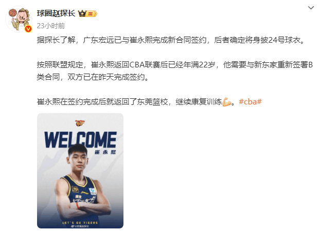 北京时间9月19日消息,篮球博主@球圈赵探长 表示,广东宏远已经与崔永熙完成新合同签约,他将身披24号球衣。