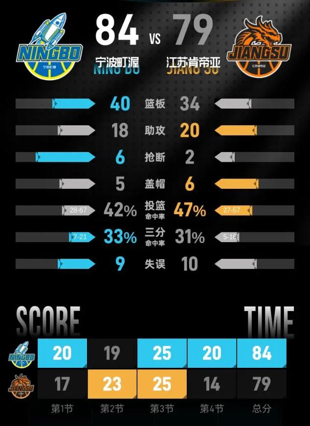 北京时间1月1日CBA常规赛第9轮,客场作战的宁波町渥以84-79击败江苏肯帝亚,江苏肯帝亚遭遇4连败,宁波町渥取得4连胜。富兰克林·杰克逊29分3篮板6助攻,哈里·贾尔斯15分10篮板3助攻。