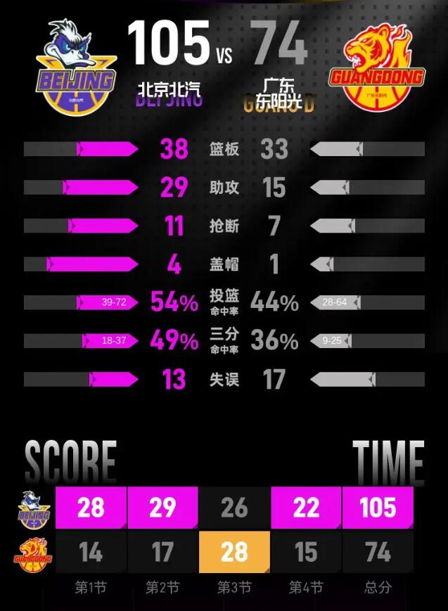 四节的具体比分为28-14、29-17、26-28和22-15(北京队在前)。北京队这边,杰曼22分5篮板9助攻2抢断,斯佩尔曼21分10篮板,曾凡博投进4记三分18分3助攻2抢断,雷蒙11分2抢断。广东队这边,萨姆纳投进4记三分35分5篮板4助攻,萨林杰11分9篮板。整场比赛,北京队三分球37投18中!