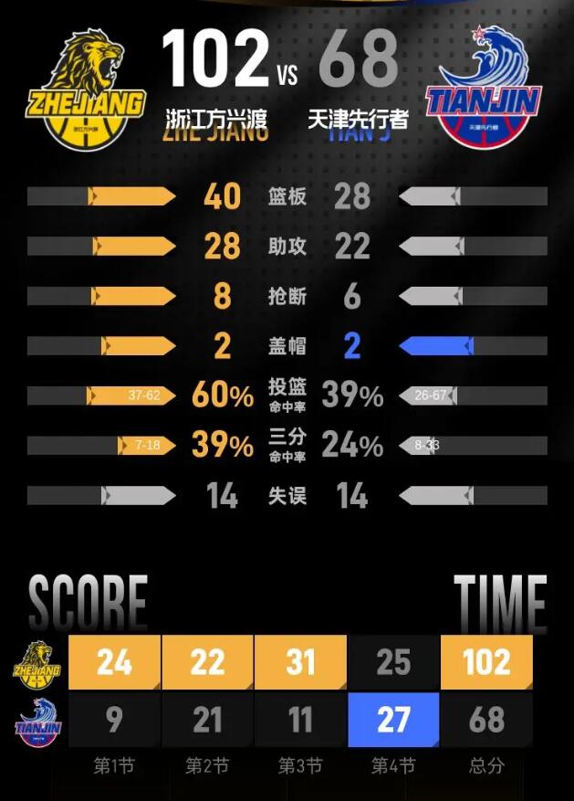 浙江方兴渡队:赵岩昊19分1篮板2助攻、雷琼·塔克17分4篮板8助攻、约书亚·卡尔顿15分7篮板1助攻、贾卡尔·桑普森15分6篮板2助攻、胡金秋10分1篮板、朱俊龙8分8篮板4助攻、赵嘉仁7分2篮板3助攻、林秉圣5分1篮板1助攻、孙铭徽4分3篮板3助攻、续峻玮2分、许可1篮板3助攻、吴骁3篮板1助攻。