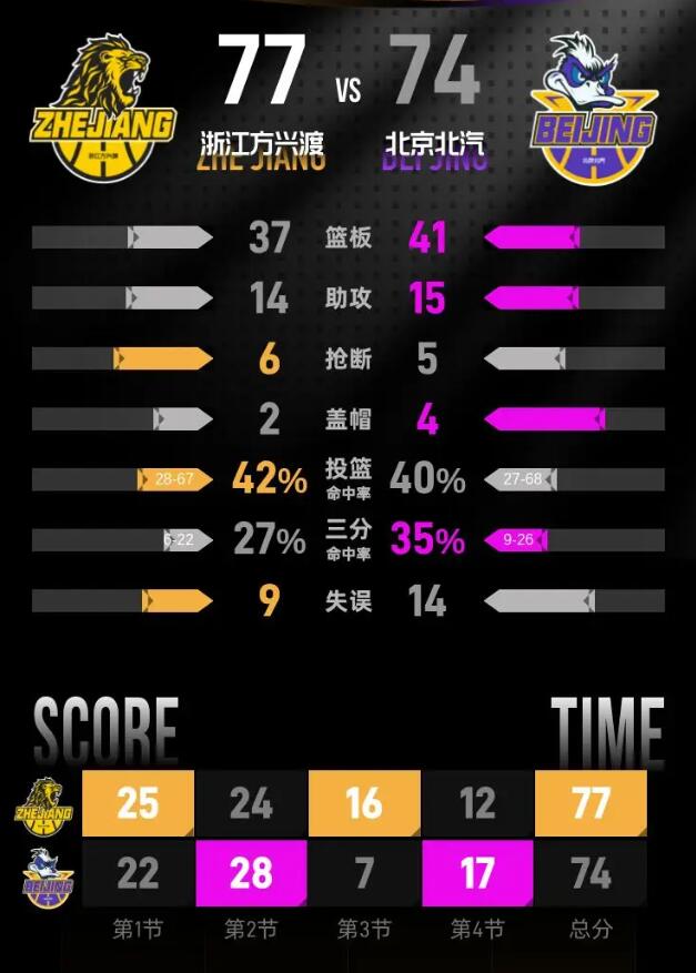 第四节,双方队伍进入白热化的竞争,场上局势趋于胶着。浙江方兴渡与北京北汽互有攻守,经过一番激烈的较量,最终浙江方兴渡以77-74赢得比赛的胜利。