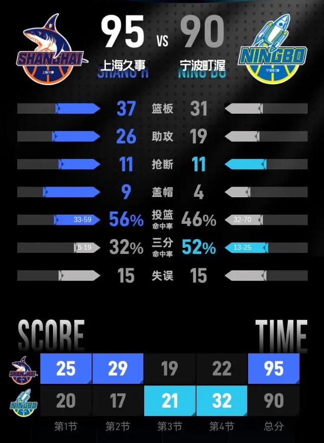 宁波町渥队:扎维尔·辛普森30分5篮板11助攻、罗凯文21分4篮板1助攻、塔克·法尔7分4篮板1助攻、戴昊7分2篮板、富兰克林·杰克逊7分1篮板3助攻、李安5分4篮板、赵建树5分、小肯扬·马丁4分1篮板、宁鸿宇3分、王子瑞1分3篮板3助攻、鲁吐布拉2篮板。