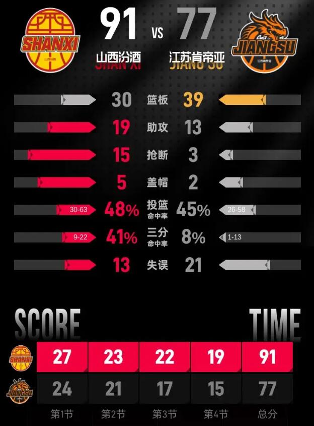 第四节,山西汾酒一开局便势不可挡,凭借一波进攻迅速打出21分的优势。尽管江苏肯帝亚不甘示弱,紧追比分,但进入本节末段时,山西汾酒的领先优势依然保持。此节中,山西汾酒的贾明儒表现优异,单节贡献11分,其中包括3记三分球。最终,山西汾酒以91-77赢下比赛。