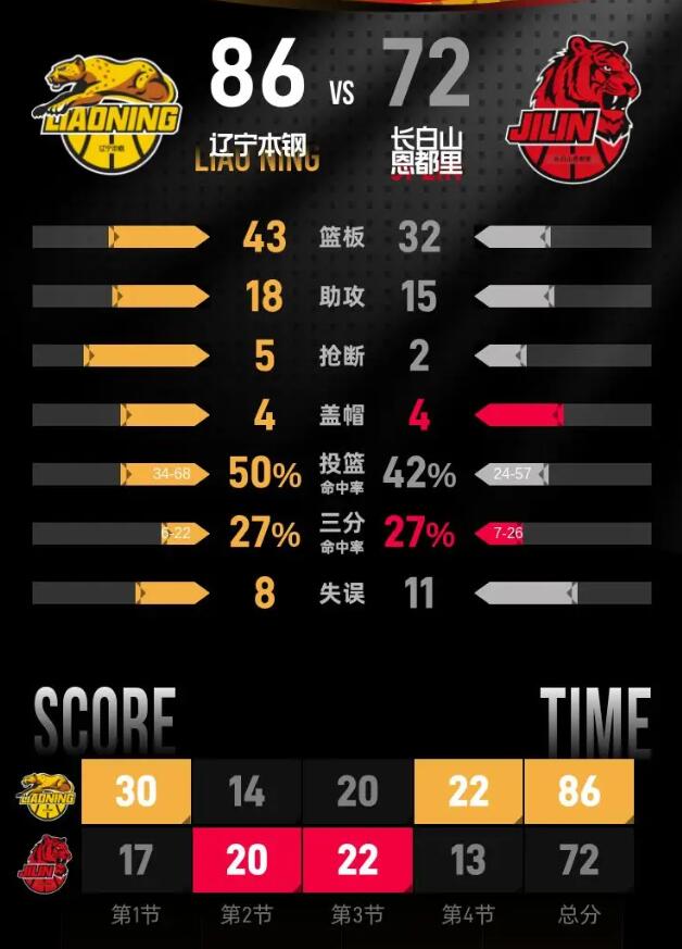 第四节开始,辽宁本钢迅速进入比赛节奏,发起猛烈攻击,快速建立起14分的领先优势。长白山恩都里并未放弃,努力追赶比分,通过不断的进攻来缩小差距。尽管对手奋力追赶,但辽宁本钢始终保持优势,最终以86-72赢得比赛。