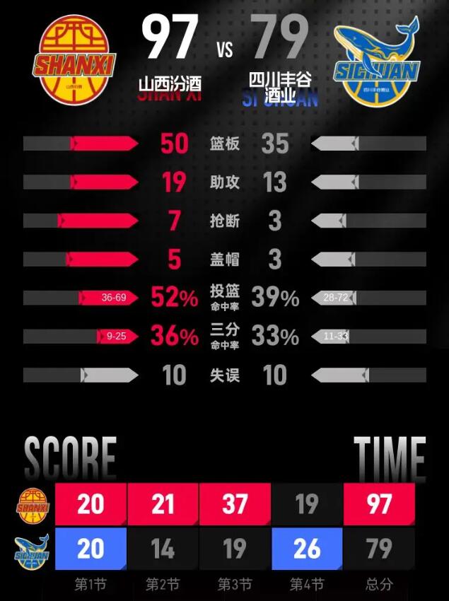 全场具体比分(山西汾酒队在后):20-20、14-21、19-37、26-19。