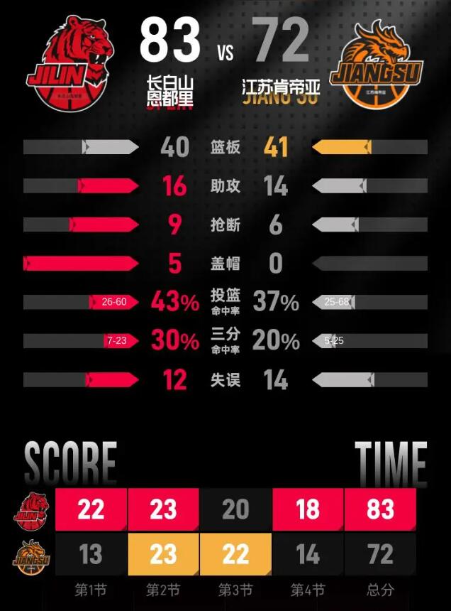 第四节,比赛进入胶着阶段,长白山恩都里与江苏肯帝亚的攻防较量愈发激烈。尽管江苏肯帝亚全力追赶,长白山恩都里依旧稳住了局势,最终以83-72赢下比赛,锁定胜局。