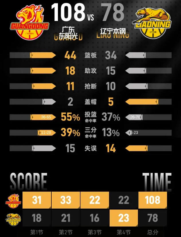 最后一节,广东东阳光持续掌控比赛节奏,再次巩固了自己的领先地位,辽宁本钢在这样的局面下缺乏翻盘的机会。最终,广东东阳光以108-78战胜辽宁本钢,取得了胜利。