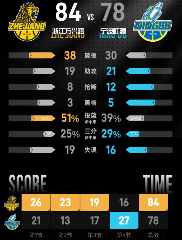在最后一节,宁波町渥的表现堪称糟糕,一度比分落后达到21分。尽管在节中进行了一次强势反击,将分差缩小至6分,但浙江方兴渡的进攻灵感依旧强烈,并在本节末段保持了明显的优势。最终,浙江方兴渡以84-78赢下比赛。