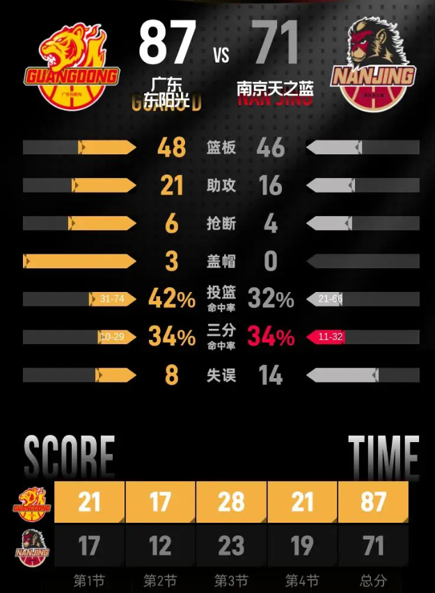 第四节,南京天之蓝在开局阶段展开反攻,试图缩小分差,一度将比分追至66-74。然而,广东东阳光迅速回应,连续得分将分差重新扩大至20分。随着比赛进入最后阶段,南京天之蓝奋力追赶,但最终未能扭转局势,广东东阳光以87-71赢得了比赛。郭昊文在本节表现抢眼,砍下10分,其中包括3记三分球。
