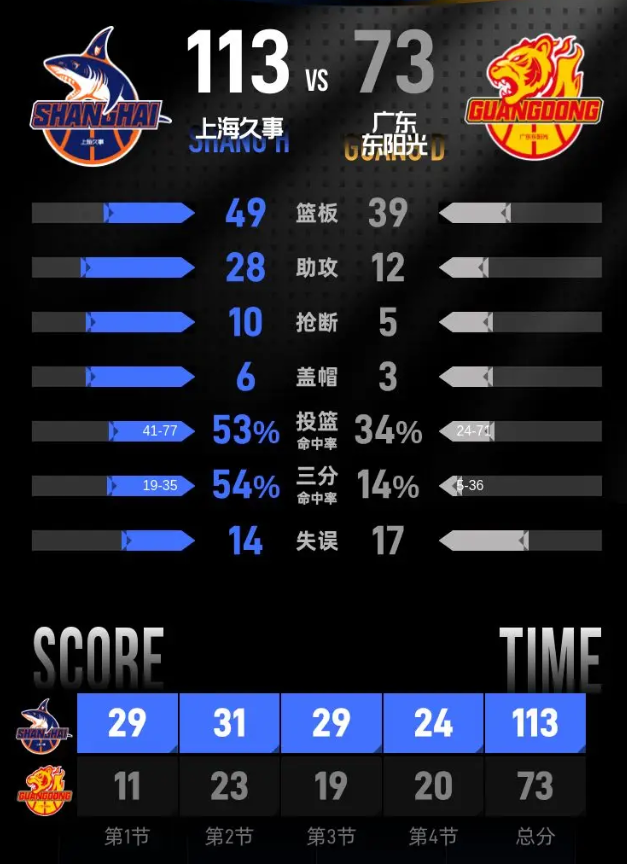 最后一节的比赛开始,上海久事迅速将分差扩大至51分,展现出强大的实力。在小节后段,广东东阳光展开反击,试图缩小比分差距。本节中,上海久事的肯尼思·洛夫顿再获10分,其中包括2记三分球。最终,上海久事以113-73赢下比赛。