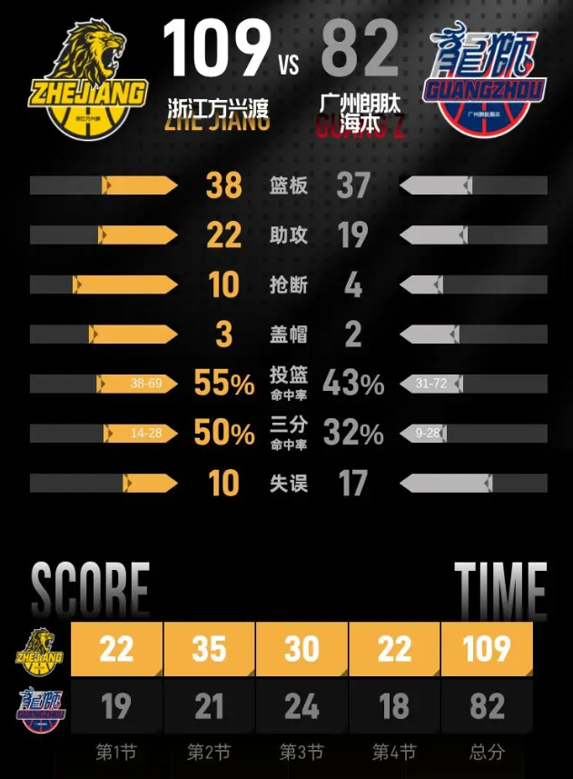 第四节开始后,双方互有攻守,分差一度缩小至19分。随着时间的推移,浙江方兴渡逐渐稳住阵脚,并在随后的一波攻势中打出31分的优势,尽管广州朗肽海本努力缩小比分,但最终以109-82结束比赛,浙江方兴渡成功赢得胜利。
