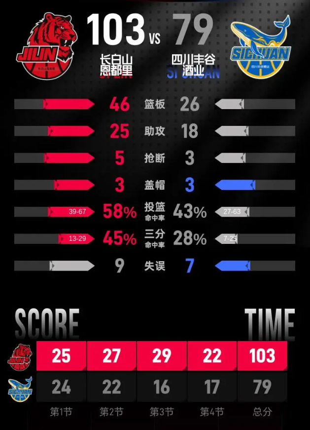 四川丰谷酒业队:段睿骐23分2篮板3助攻、景菡一15分2篮板1助攻、沙莫里·庞兹15分3篮板7助攻、李玮颢12分4篮板3助攻、杨文学5分4篮板、杜智博4分1篮板、张力升2分1篮板、戈尔乔克·加克2分2篮板3助攻、苏若禹1分1篮板1助攻、左朕年1篮板。