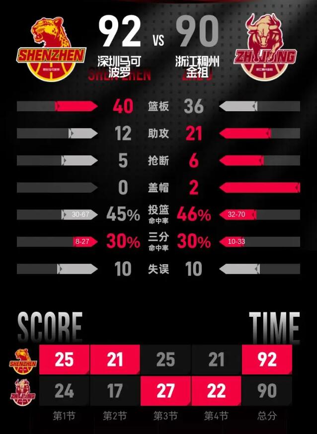 第四节,最后一节比赛的紧张氛围在场上弥漫,双方继续保持高强度的对抗。深圳马可波罗的特奎维恩·史密斯再度发力,拿下15分,最后时刻上演三分压哨绝杀,帮助深圳马可波罗以92-90战胜浙江稠州金租,获得了比赛的胜利。