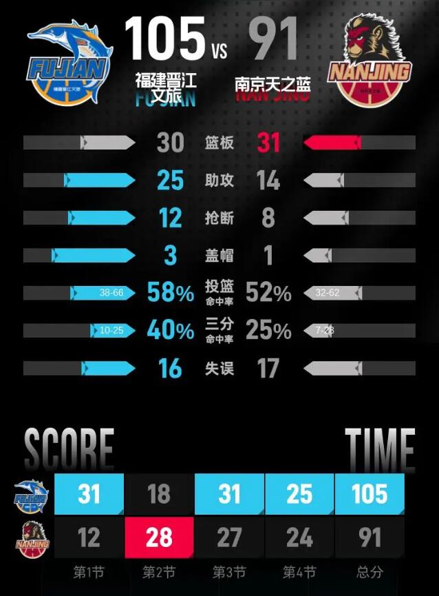 第四节,福建晋江文旅延续了良好的状态,开局迅速形成攻势,将优势扩大至19分。面对强劲的对手,南京天之蓝展开反攻,成功将分差缩小至8分,给比赛增添了悬念。在关键时刻,福建晋江文旅稳住了进攻节奏,逐步重新拉开比分,最终以105-91赢得比赛的胜利。