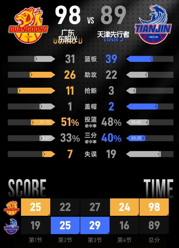 进入最后一节,广东东阳光逐渐掌握比赛节奏,展现出强大的进攻实力,将比分反超至11分。尽管天津先行者在后段努力追分,试图缩小分差,但未能改变结果。此节中,广东东阳光的胡明轩贡献11分,含2记三分球,最终以98-89赢得比赛。