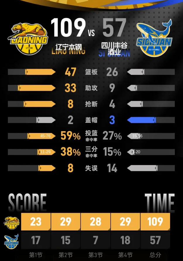 第四节,四川丰谷酒业展现出不甘放弃的斗志,试图缩小劣势,将比分追至42-80。但辽宁本钢随即回击,再次将分差扩大至55分,展现出强大的控制力。比赛后段,四川丰谷酒业努力再次追分。最终,辽宁本钢以109-57赢下比赛。