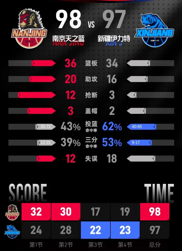 第四节,南京天之蓝开局强势,通过一波迅猛的攻势将分差扩大至82-75。随后新疆伊力特奋起直追,不仅将比分抹平,还一度领先南京天之蓝9分。然而,在比赛的后段,南京天之蓝逐渐缩小分差,扭转了局势。这一节中,南京天之蓝的杰伦·汉兹表现亮眼,独得15分,其中包含1记三分。最终,南京天之蓝以98-97赢得比赛。