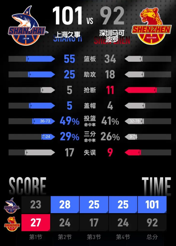 第四节,上海久事一开场便展开连续进攻,迅速将分差扩大到85-72。然而,深圳马可波罗在关键时刻发力,不仅追平了比分,更在后段一度反超1分。尽管如此,上海久事在最后时刻稳住了局面,逐渐拉近分差。此节中,哈桑·怀特塞德为上海久事贡献了10分,而贺希宁为深圳马可波罗再次拿下11分,包括1记三分。最终,上海久事以101-92赢得比赛。