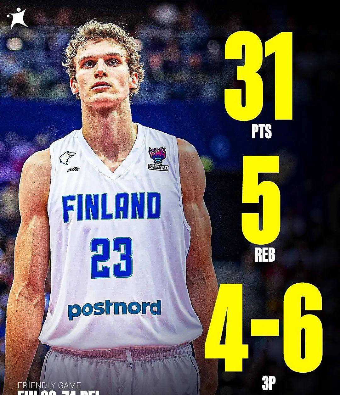 北京时间8月12日,欧洲杯前夕的一场热身赛中,芬兰国家男篮以92-74大胜比利时。芬兰队的核心球员马尔卡宁再次展现其出色表现:全场12投命中8球,三分球6中4,罚球12中11,拿下了31分5个篮板和2个抢断。本届欧洲杯将于8月28日开幕,芬兰队被分在G组,与塞尔维亚、格鲁吉亚和丹麦同组竞争。