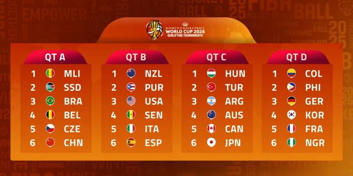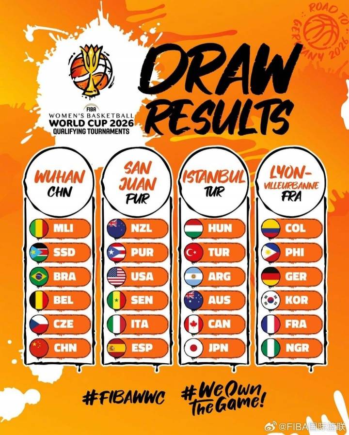 10月8日,2026年女篮世界杯预选赛抽签结果出炉,24支球队被分为4组进行比赛。中国女篮与比利时、巴西、捷克、马里和南苏丹同在A组。