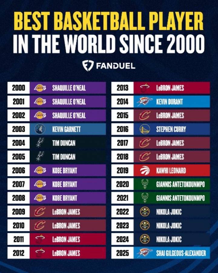 7月28日消息,美国媒体评选2000年以来的世界最强球员,詹姆斯霸榜8年,约基奇、科比、奥尼尔都是三年。