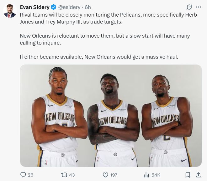 北京时间10月4日,NBA记者埃文-斯迪瑞报道,多支竞争对手密切关注鹈鹕,特别是赫伯特-琼斯与特雷-墨菲这两位侧翼球员。目前鹈鹕还不愿意交易他们,但如果新赛季开局不利并接到大量咨询电话,这两人任何一人进入交易市场,鹈鹕都可以得到丰厚回报。