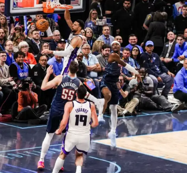 比赛开局,雷霆便展现了主场气势。霍姆格伦持球突破德罗赞的防守,迎着尤班克斯完成一记势大力沉的双手隔扣,瞬间点燃全场。然而国王并未慌乱,威斯布鲁克连续抢断成功,策动反击,带领球队回敬一波10-4的小高潮反超比分。雷霆核心亚历山大随即站了出来,他先是借助挡拆命中急停三分,随后又强硬打成2+1,帮助球队重新夺回领先。首节结束时,雷霆以微弱优势领先。